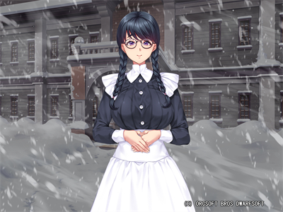 女仆看起来只有18岁的年龄,带着衣服黑框眼镜。紫色的眼瞳看起来很是可爱,乌黑的头发在身前被梳成两条麻花辫。本来将身体包裹的严严实实的女仆装,不知为何,却让原本就非常傲人的胸部,更加凸现了出来。